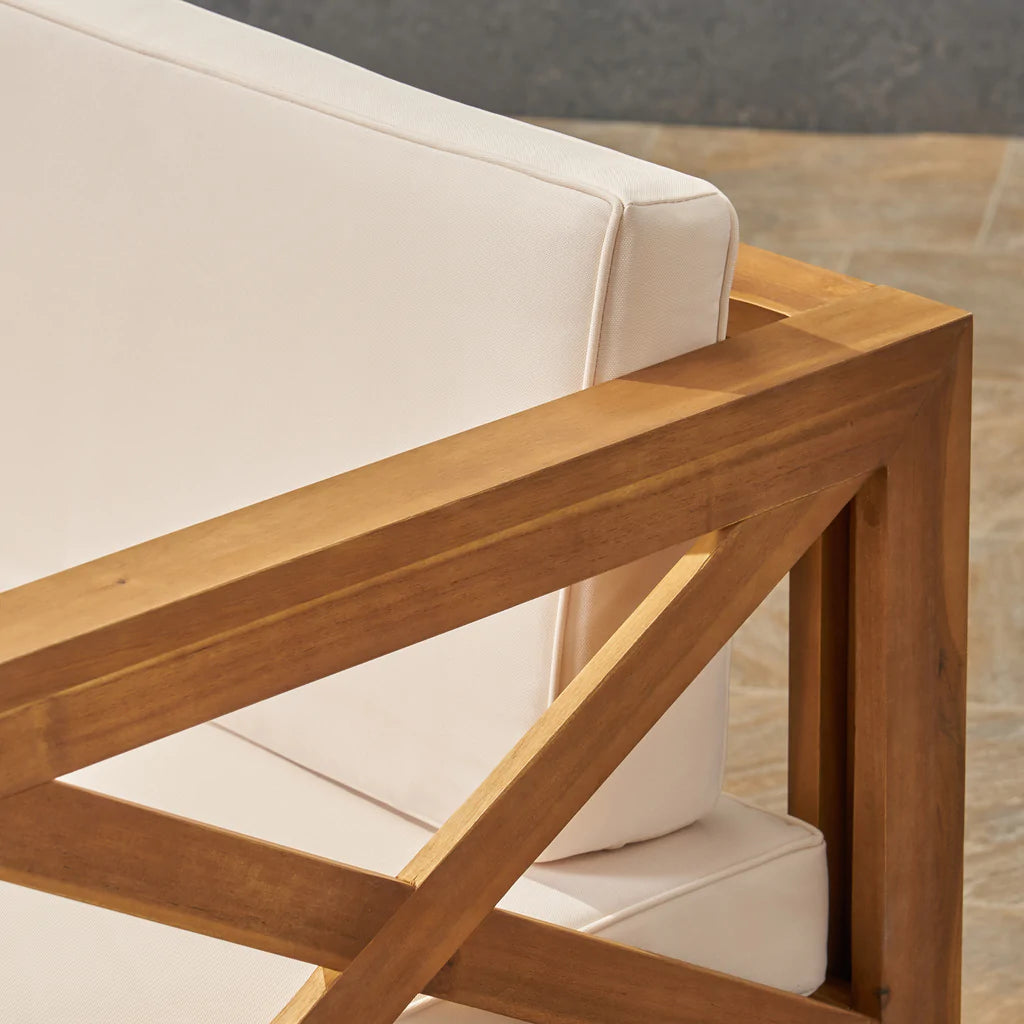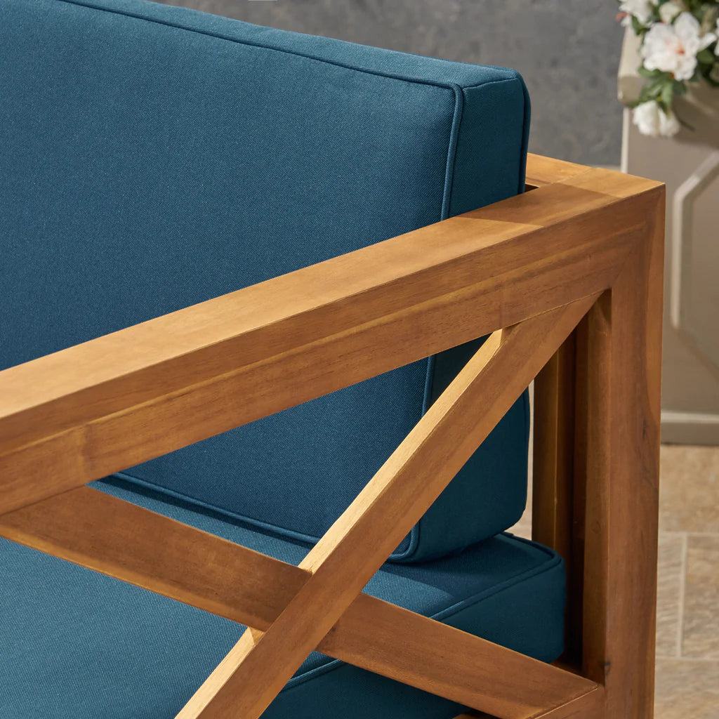 Lounge out in the summer sun with a cool drink or enjoy having guests over for coffee with our spacious outdoor sofa set that excels in style and comfort. This set includes a three-seater sofa, an ottoman, and a coffee table, making this set perfect for hosting small outdoor get-togethers or just for lounging about outside with a good book. Featuring wooden X-panel frames and fresh cushion colors, our set brings a timeless look to any outdoor space that will last for years to come.