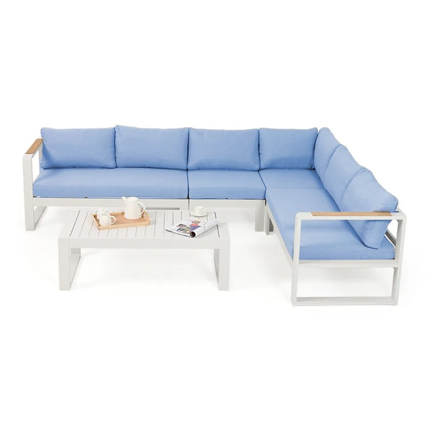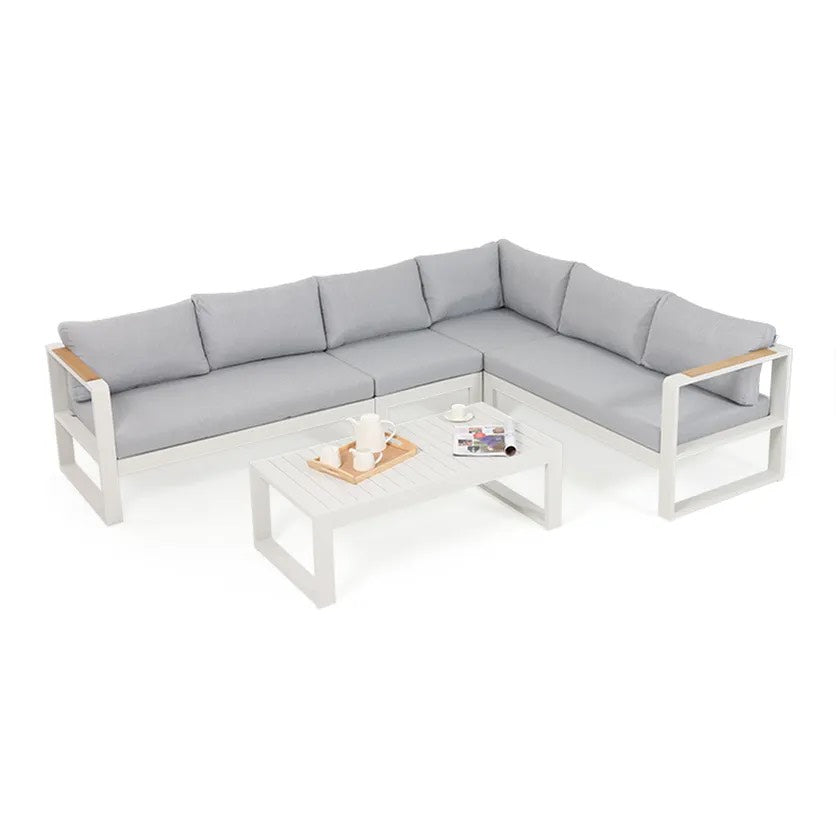 Inject some exotic luxury into your outdoor space with this comfy, modern sofa set. Designed for comfortable seating of six, this outdoor sofa set comprises two pieces of two-seater sofas, an armchair, a corner sofa, and a coffee table. Constructed of powder-coated metal, this furniture set is perfect for the outdoor environment. Additionally, the fabric used for cushioned seats is an olefin, which is widely known for its durability and stain-resistant feature.