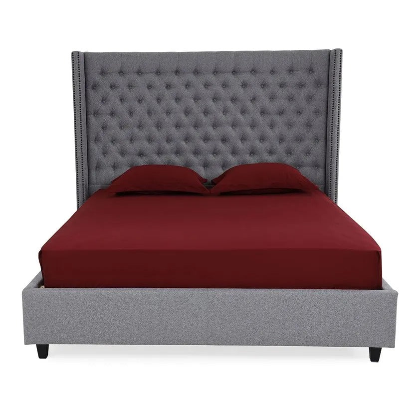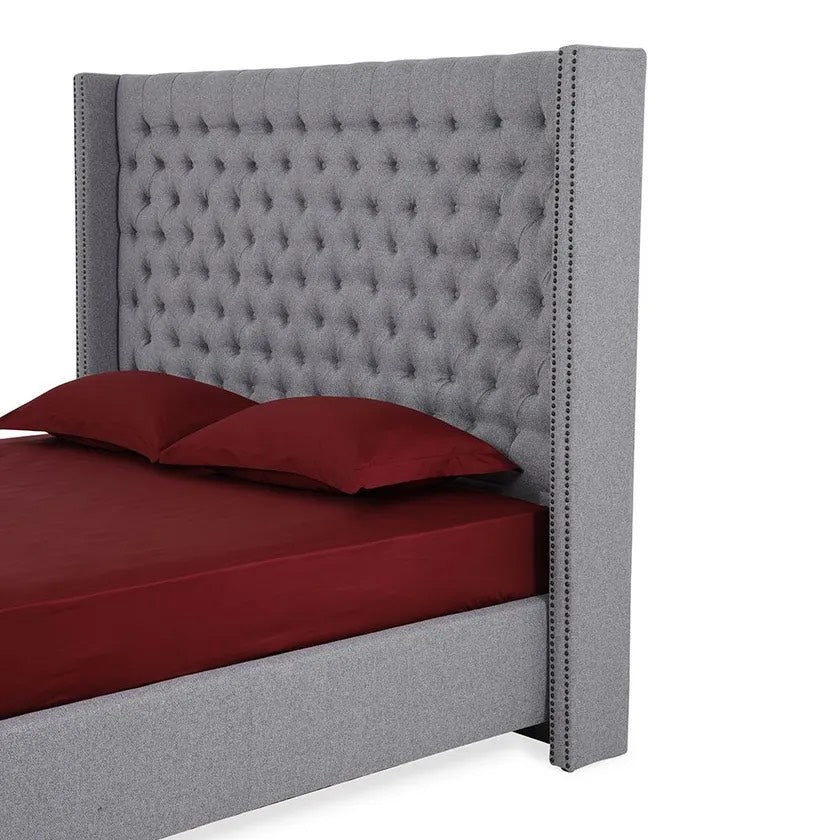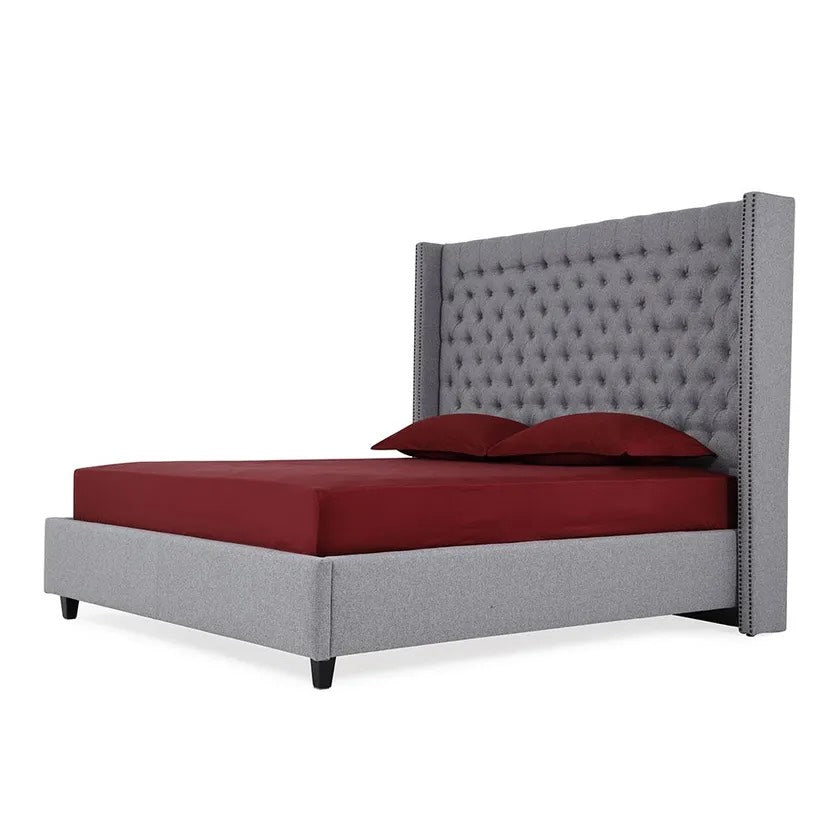 This bed from the Verrazzano collection is an understated and inviting foundation for your restful retreat. Diamond button tuft detailing on the long headboard and double row, and nailhead trim on the wings define this furniture. Upholstered with quality fabric in grey, this bed blends effortlessly into any aesthetic.